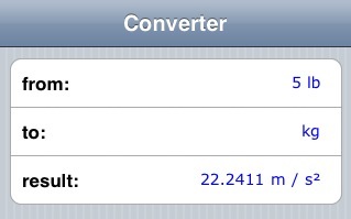 Units is not you mom’s unit converter. It does not mindlessly convert pounds to kilograms. Pounds are in the “force” dimension, kilograms are in “mass.” When you try this you will get units of acceleration, because that’s what Newton said should happen: Force = mass times acceleration. if you want kilograms on Earth, multiply times “g”.